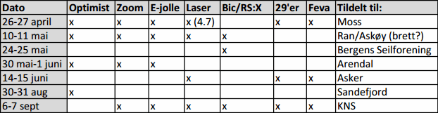 Utover dette blir det tur til Moss, Arendal og Sandefjord for Optimistene og Asker, KNS og Gøteborg for Laserne.